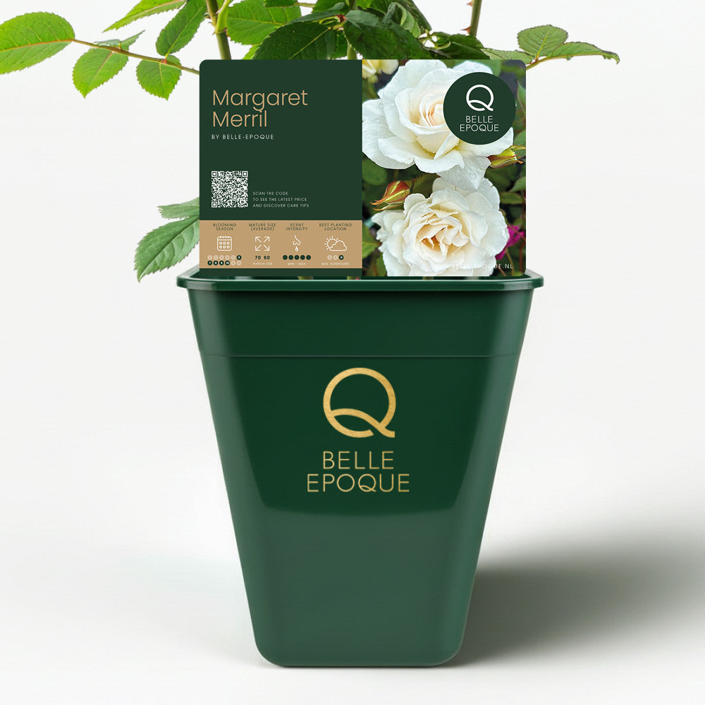 De Rosa Margaret Merril is een verfijnde floribunda, geïntroduceerd door Harkness in 1977, en wordt wereldwijd geroemd om haar elegante schoonheid en onvergetelijke geur. Haar zuiver witte bloemen openen met een vleugje zachtroze in het hart, wat zorgt voor een subtiel en klassiek kleurenspel.